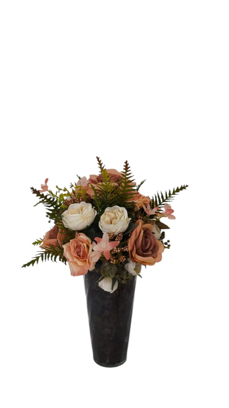 arranjo artificial, contendo: vaso de vidro rosas tons terre cota rosas...